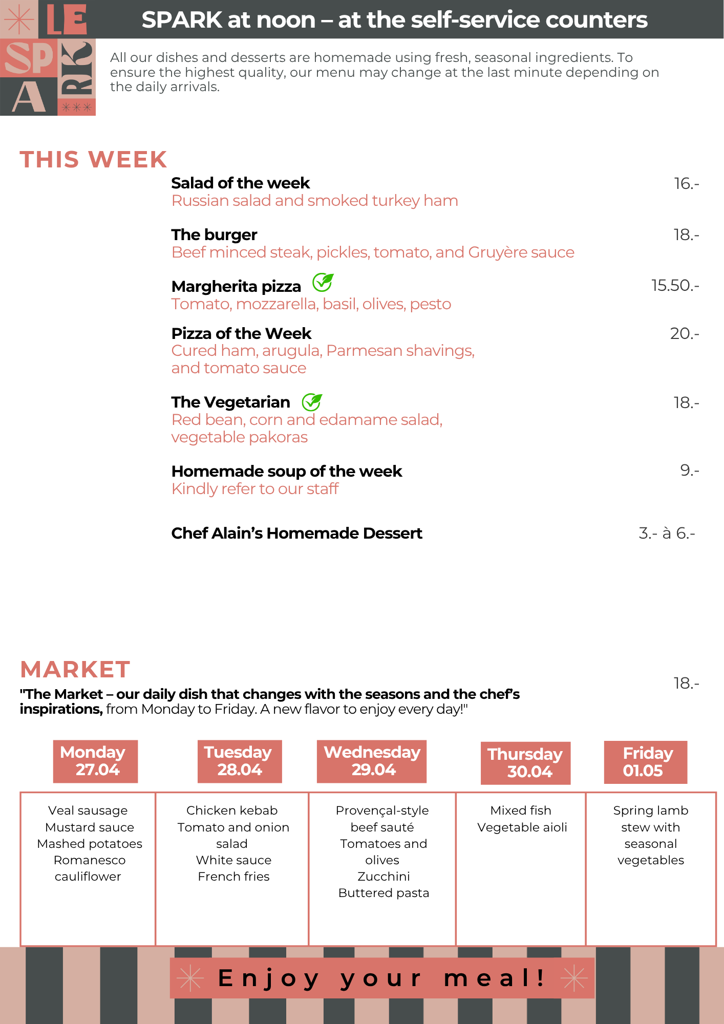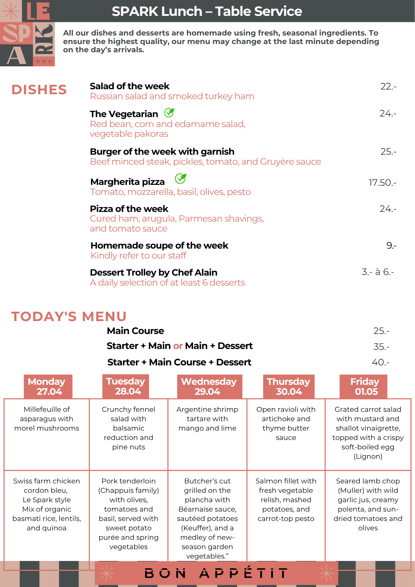 Enjoy a unique culinary experience every week! Our Chefs select fresh, seasonal ingredients to create dishes that reinvent tradition and surprise your taste buds.